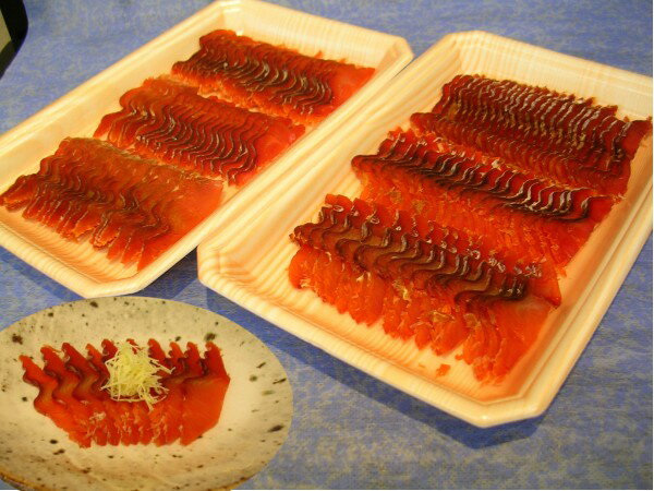 鮭の酒びたしスライス(200g) (説明)秋鮭をおよそ半年間、日本海の寒風にさらし、乾し上げました。村上地方に伝わる独特の高級古典料理です。 薄くスライスしております。お好みによっては生姜やレモン汁を加えても一段と風味がでて美味しくいただけます。ご贈答用に最適です。 みのもんたの午後は○○おもいっきりテレビで紹介されました。塩引き鮭を作るのに適した気候の村上ならではの食べ物。※鮭と日本酒、両方に豊富に含まれるアミノ酸で免疫の向上DHAは生の鮭の約3倍!   ■品名 鮭の酒びたし ■原材料 鮭(国産)、塩 ■内容量 200g ■保存方法 常温 ■賞味期限 90日 ■送料 全国一律880円 日本テ